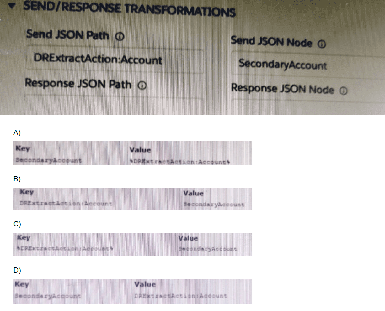 Therefore, the correct option is the one where the Key is the desired new node name (e.g., SecondaryAccount) and the Value is the merge field reference to the original data node (e.g., #DRExtractAction:Account#).