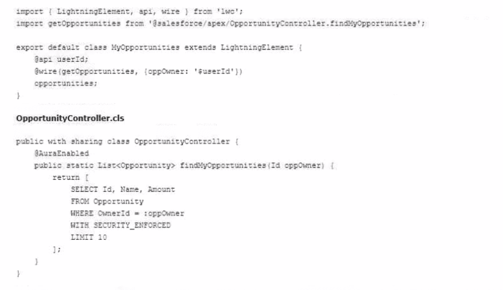 To address the issue where a Lightning Web Component (LWC) displays "Error retrieving data" when attempting to surface information about Opportunities owned by the currently logged-in user, we need to identify the likely cause based on the provided code snippets (not fully visible) and the options. Since the code snippets are not fully included, I’ll infer a common scenario: the LWC uses an @wire adapter to call an Apex method that queries Opportunities, but the call fails due to security, caching, or execution issues. Let’s evaluate the options based on LWC and Apex best practices.